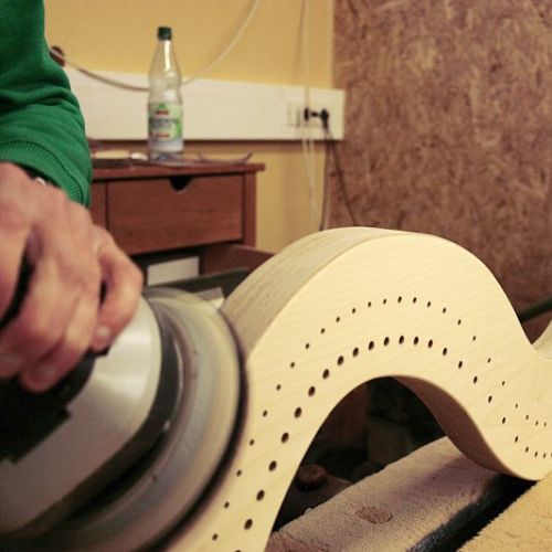 Damit die Harfen ihre wunderbar handschmeichelnden Oberflächen bekommen, braucht man exzellente hochwertige Schleifmittel - und eine ganze Menge Geduld.