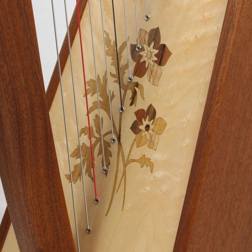 Eine wunderbare Intarsie in verschiedenen Hölzern. Auf der fertigen Harfe kommen die Holzfarben richtig zum Tragen.