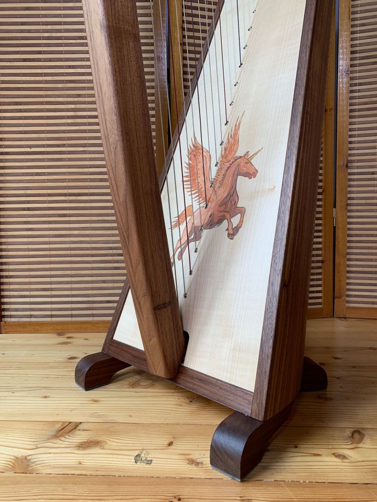 Diese Beryll aus Nussholz mit einem Pegasus auf der Klangdecke ist mit Karbon- (Stahl-)saiten bespannt. Der wundervolle Klang dieser Harfe ist bezaubernd. Sie haben die Wahl zwischen 2 verschiedenen Zierrosette am Kopf der Harfe (siehe Bilder)